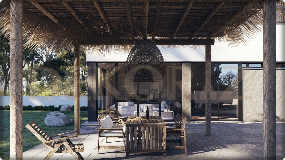 Villanın bahçesi, terası, havuzu ve diğer dış alanları konseptle uyumlu şekilde düzenlendi. Tropikal bir konseptte, egzotik bitkiler, havuz kenarı oturma alanları ve doğal taş yollar tercih edilirken, Akdeniz tarzında zeytin ağaçları, taş duvarlar ve klasik veranda mobilyaları kullanıldı.